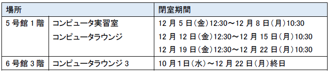 2025年度 CBT試験に伴うCP実習室等の閉室について 投稿者: 学術情報システム課 | 2025年11月20日 0件のコメント 2025年度CBT試験のため、下記期間中は、対象教室への入室を終日禁止とします。 上記期間中は、7号館1階 711教室前・3号館1階 パルテールのPC・プリンタをご利用ください。
