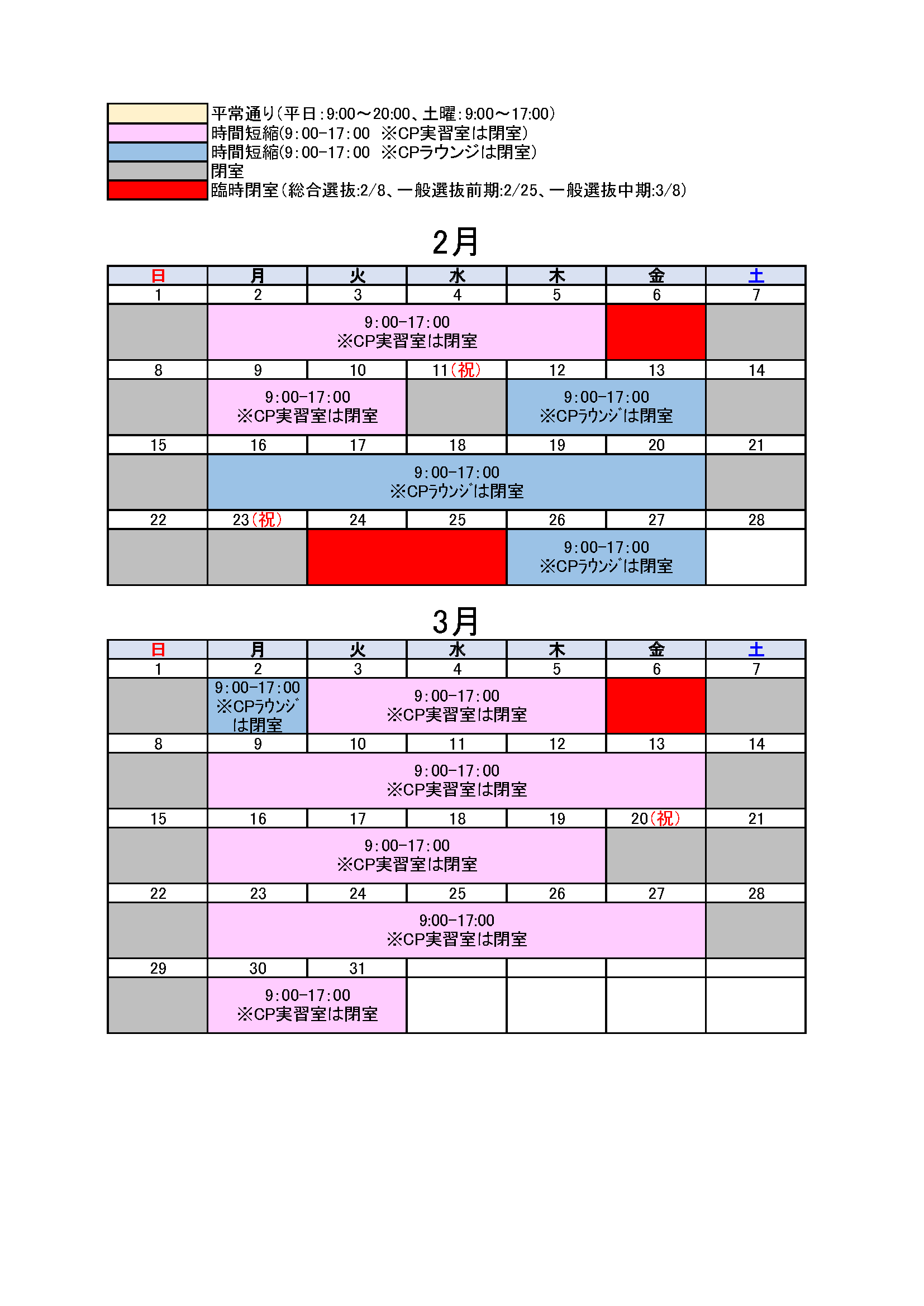 【お知らせ】2月・3月のコンピュータ実習室・ラウンジ開室状況について 投稿者: 学術情報システム課 | 2026年1月22日 0件のコメント 利用者各位 2月・3月のコンピュータ実習室・ラウンジ開室状況についてお知らせいたします。
